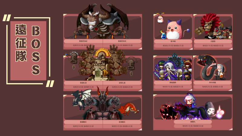 • 遠征隊系統(共 11 種):需團隊配合的大型副本。包括扎琨、龍王、皮卡咪、阿卡伊農及森雨丸等經典頭目 。需注意部分強大 BOSS 如混沌龍王有「每週次數限制」,請務必與隊友協調進場時機 。